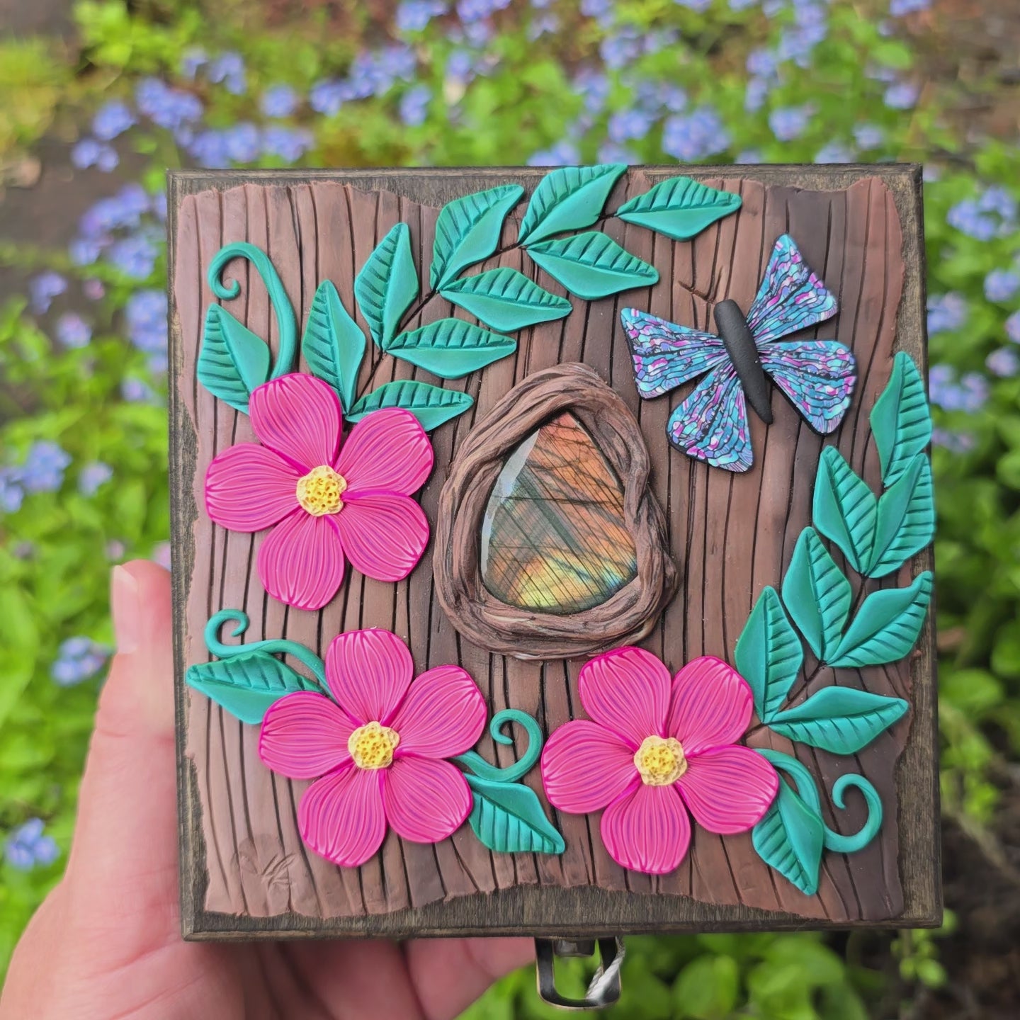 Bright flora & fauna surround a natural Labradorite cabochon.