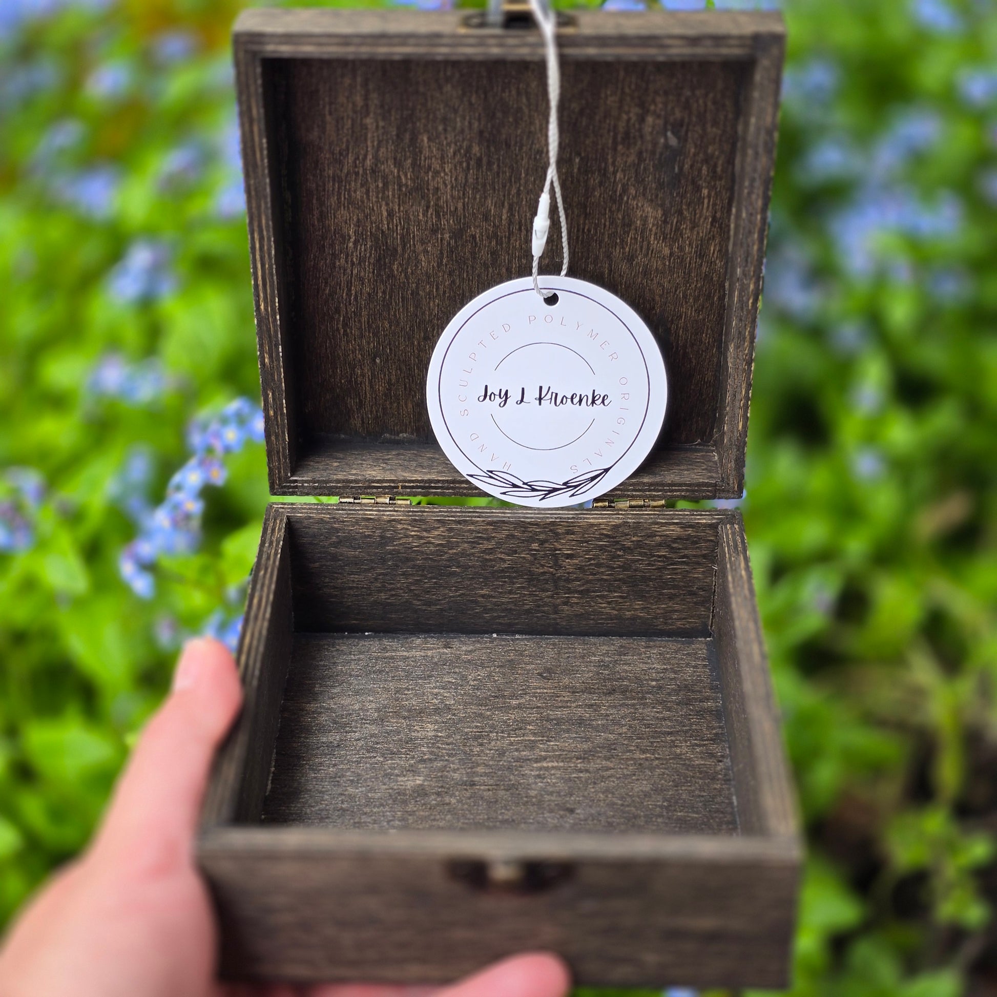 Box is 5 inches square, 2 1/2 inches deep. I administered the finish work (sanding & staining).