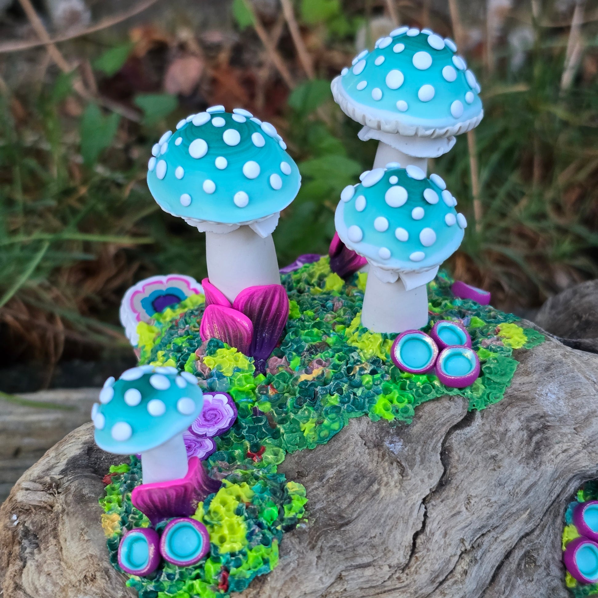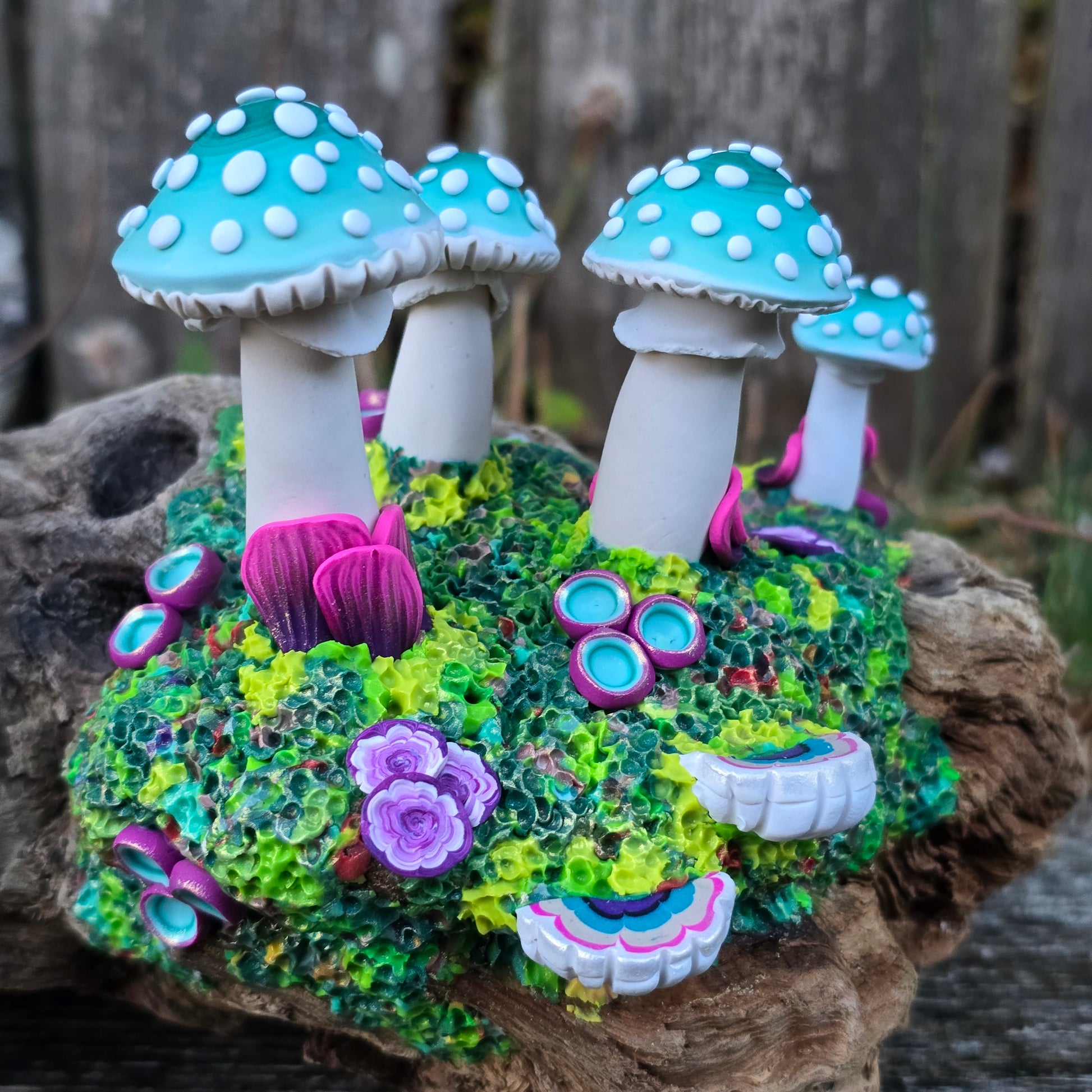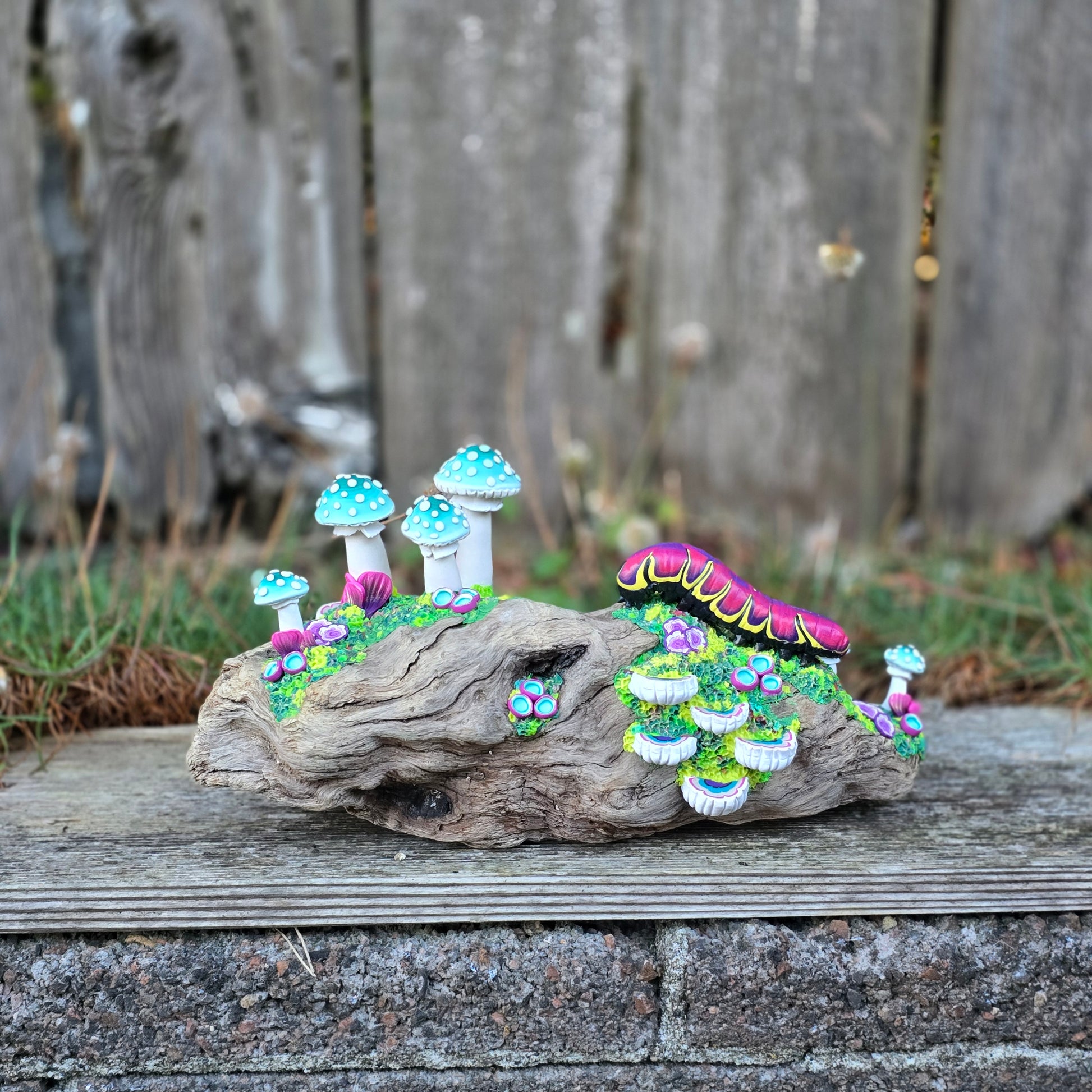 A bright Alice-esque fungi forest with a lively little Caterpillar.