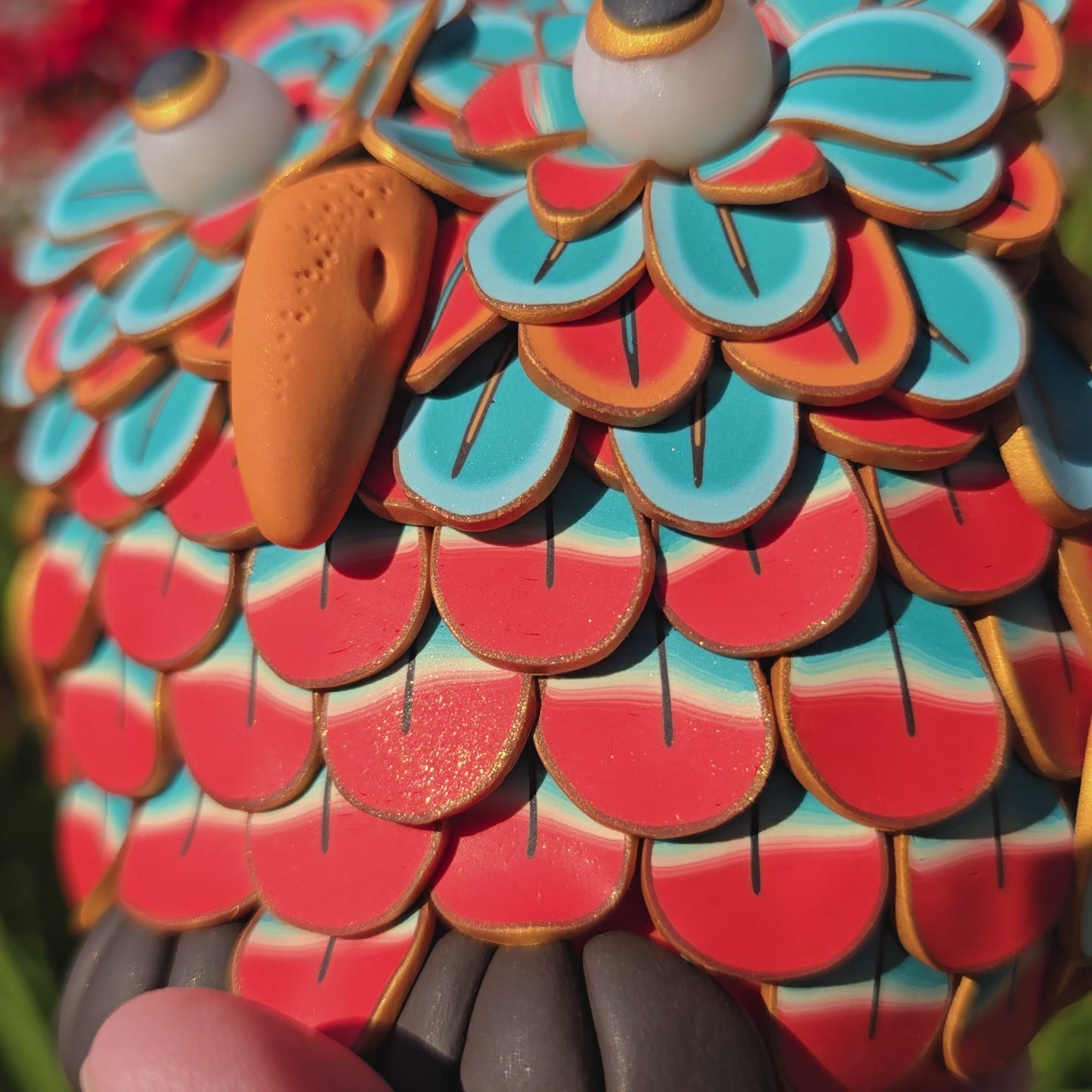 Created from colored polymer clay and my original millefiori canes over an armature. No paint. One of a kind.