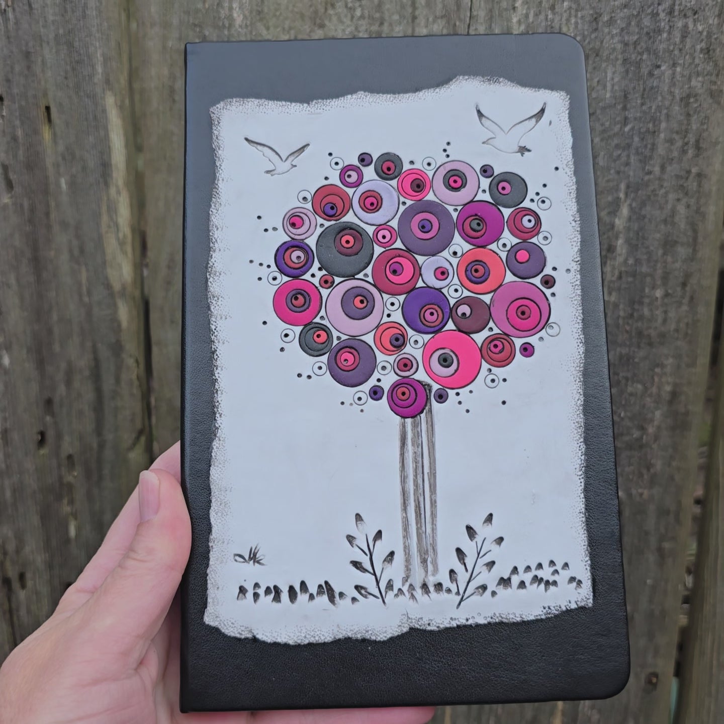 Happy trees created from colored clay, hand embellished, & antiqued to bring out the details. Attached to an A5, 160 page, 120 GSM, lined hardcover notebook. Each us unique.