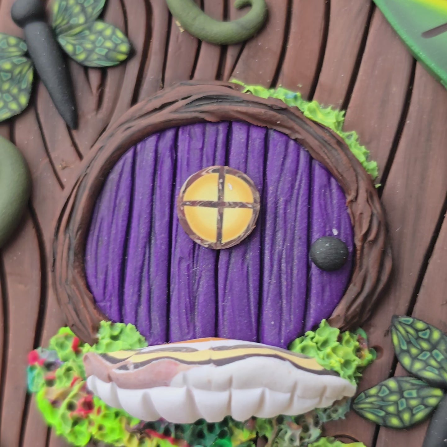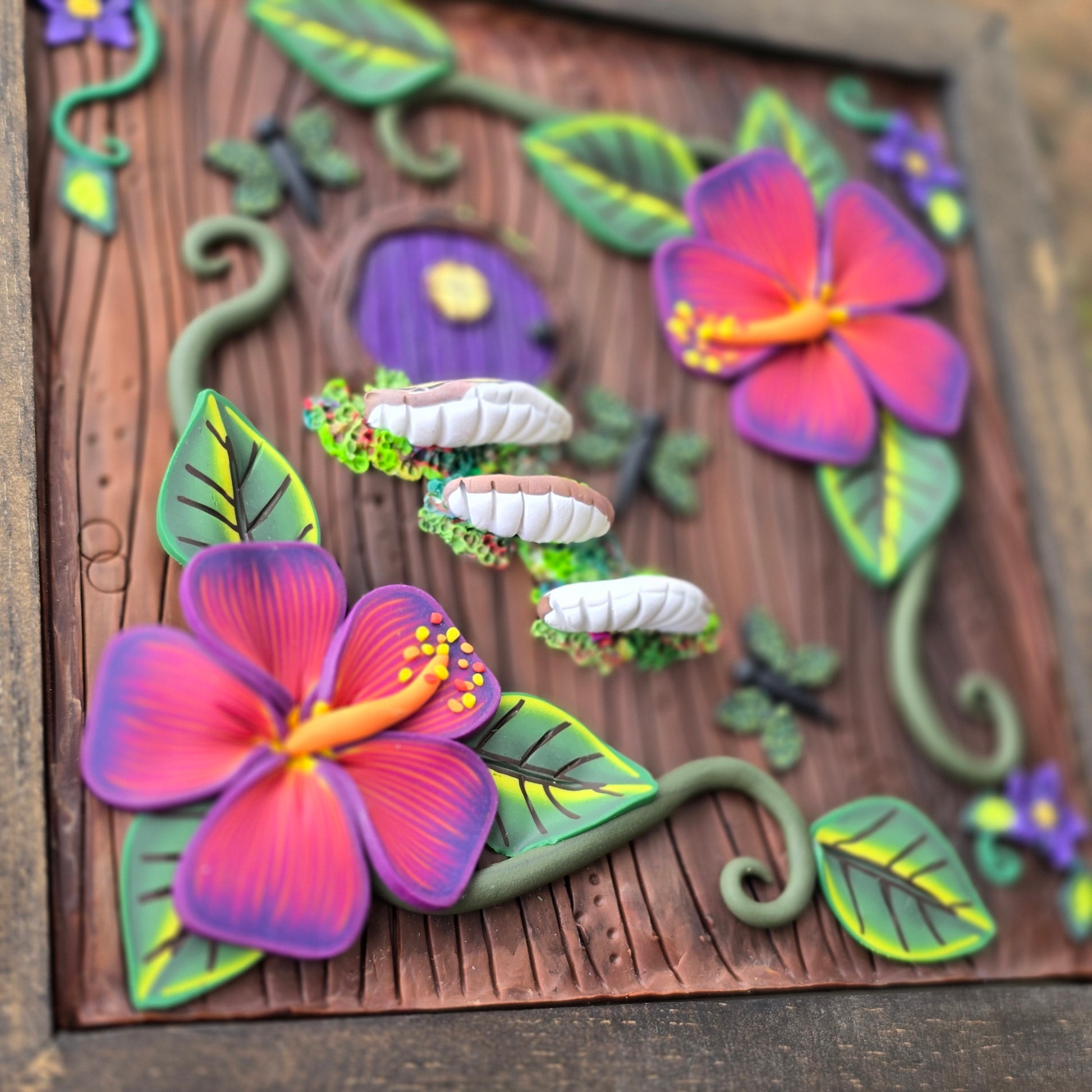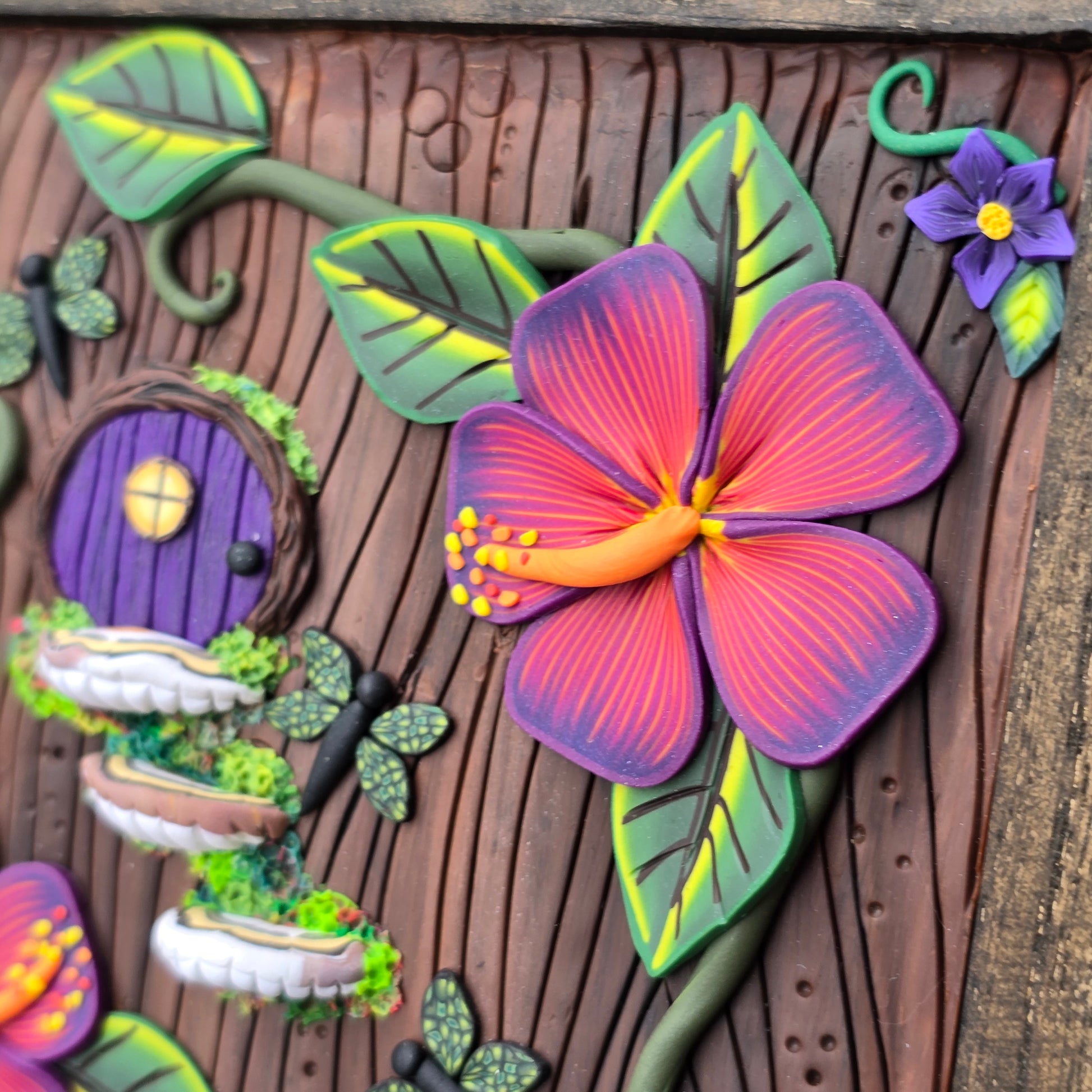 A tiny Fairy Door tucked amongst a beautiful Hibiscus garden, complete with itsy dragonflies.