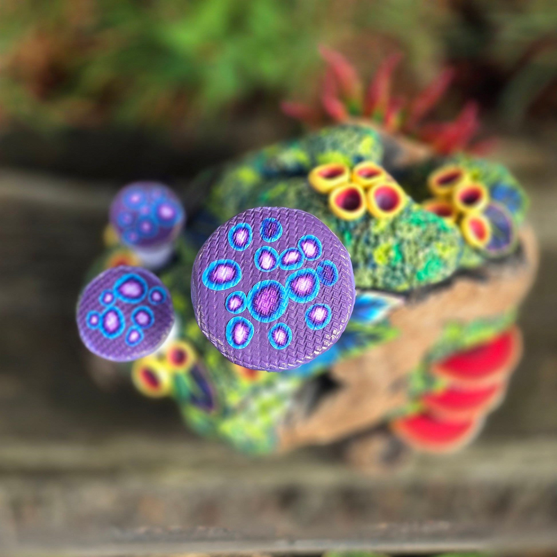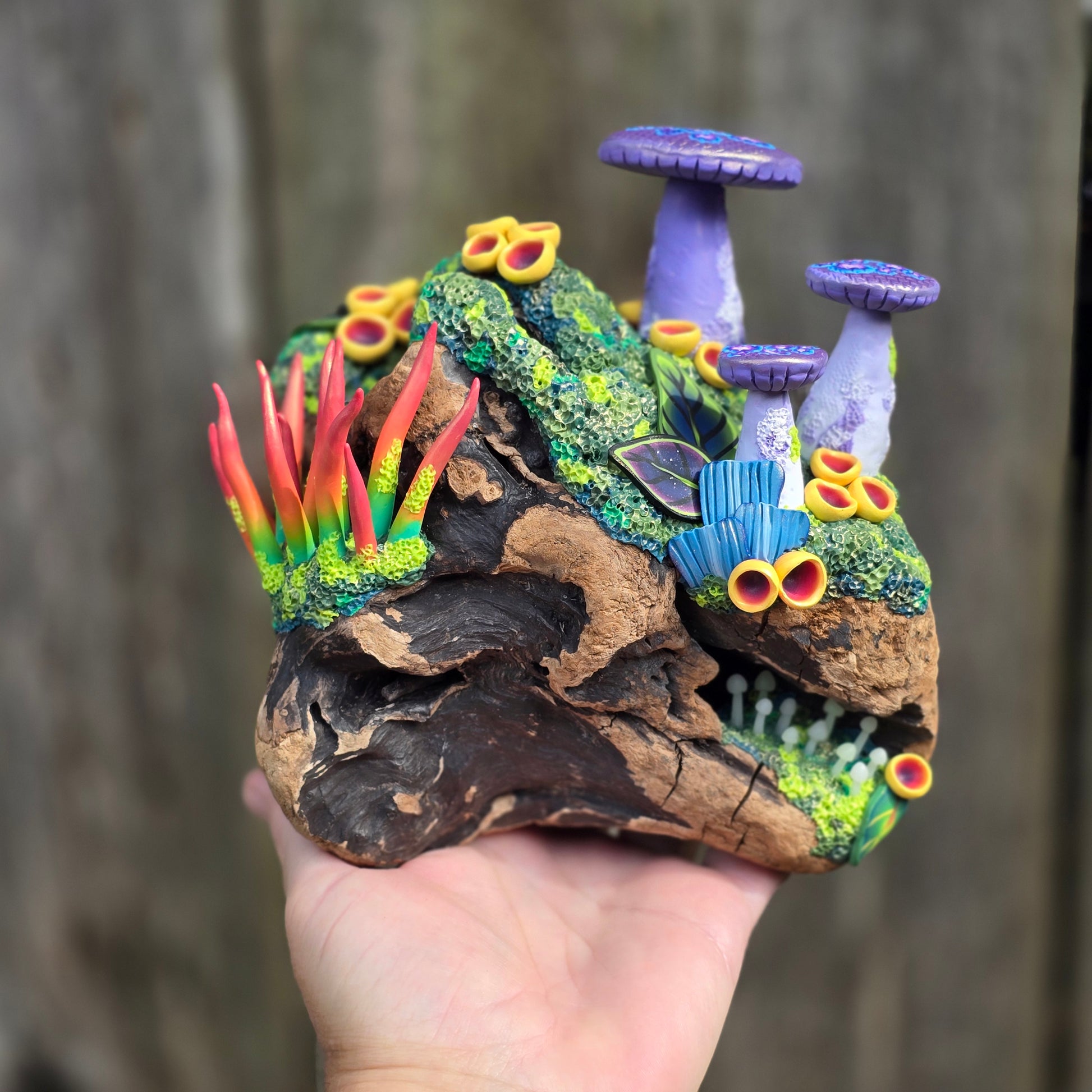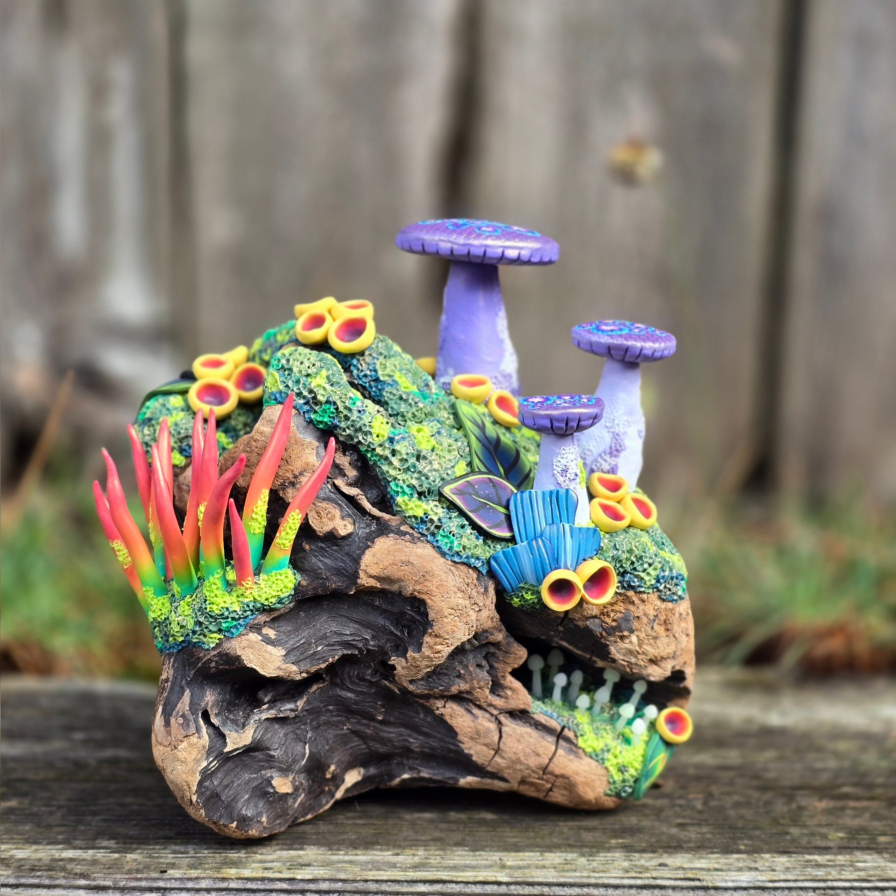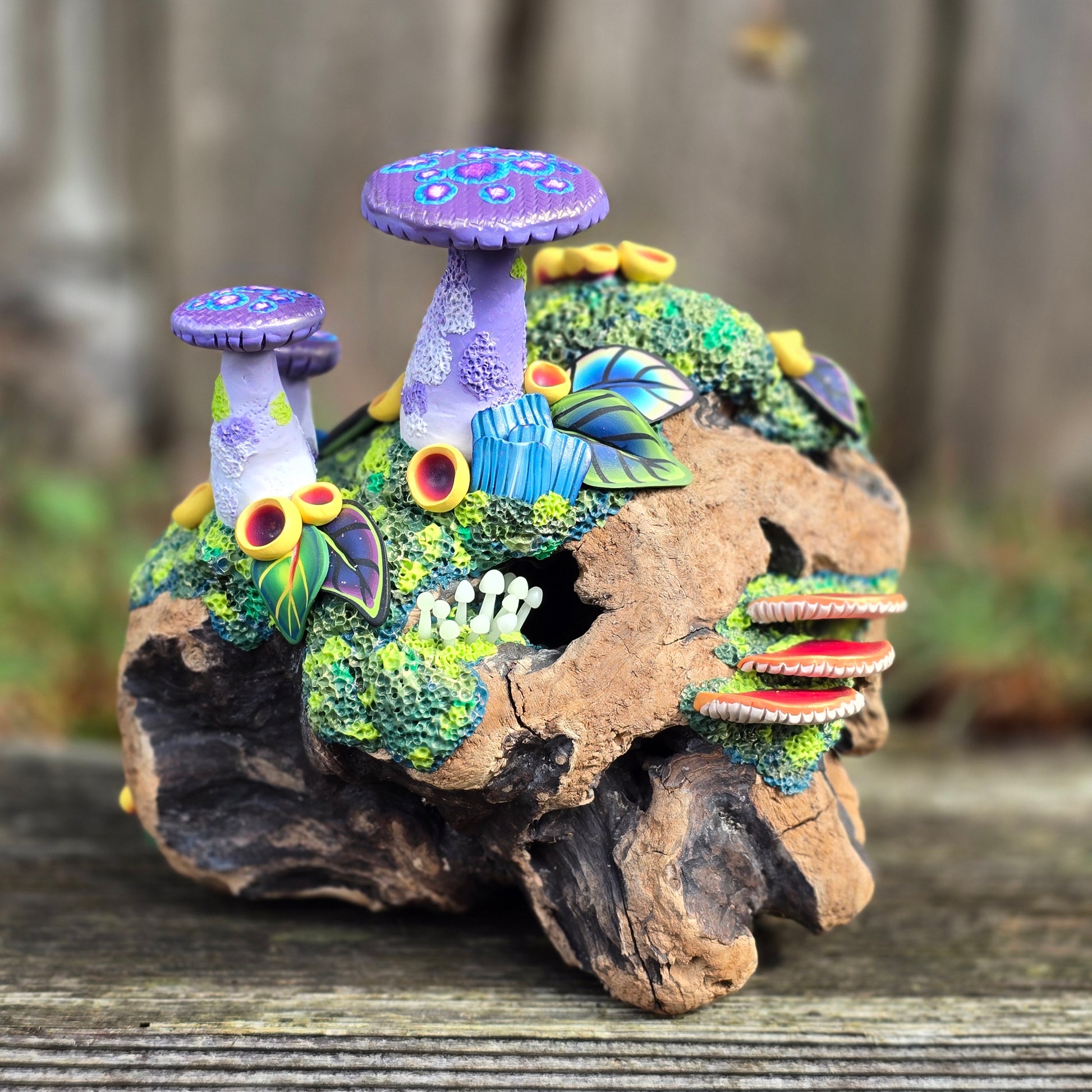 A driftwood burl reminiscent of a dinosaur skull, adorned with mushroom fantasy forest.