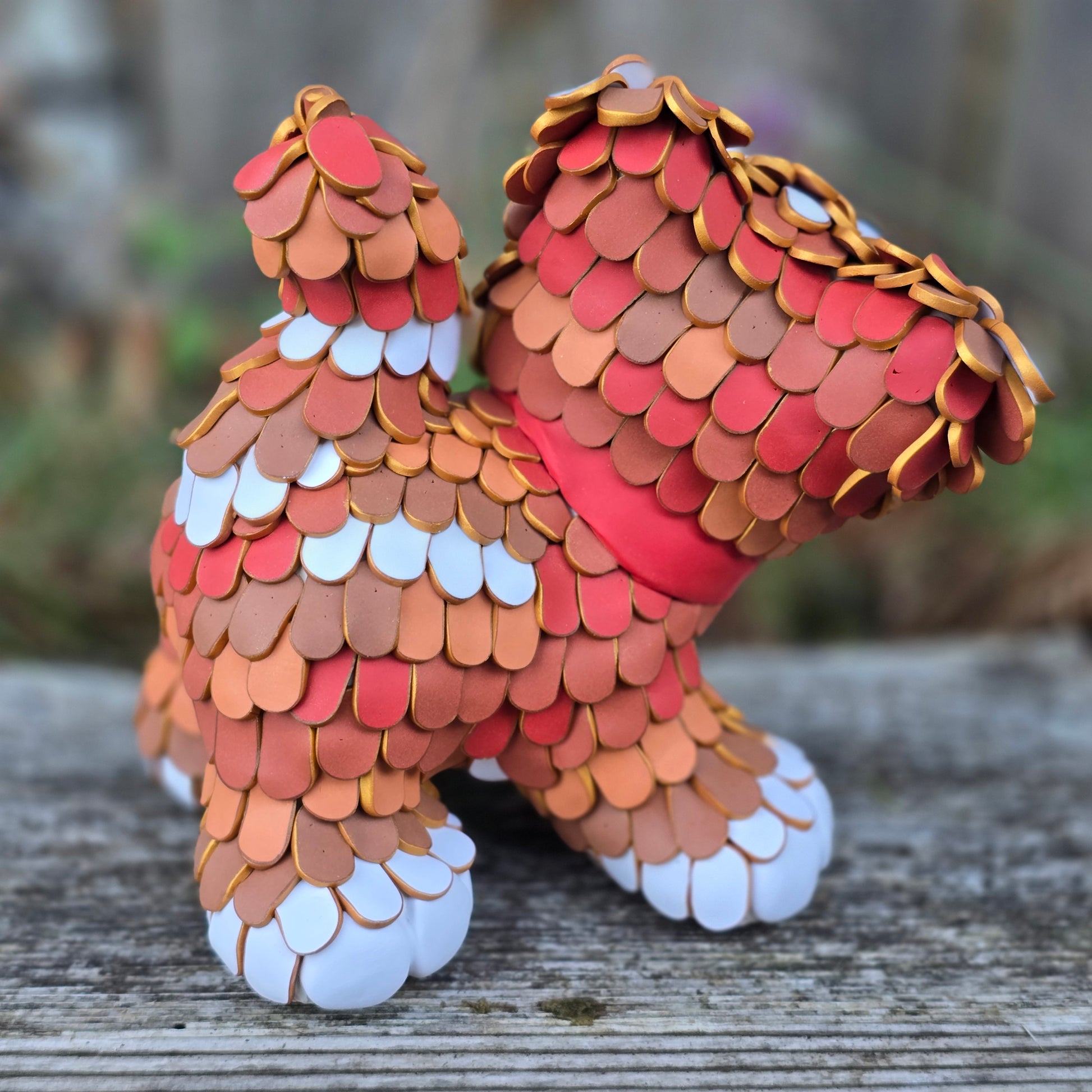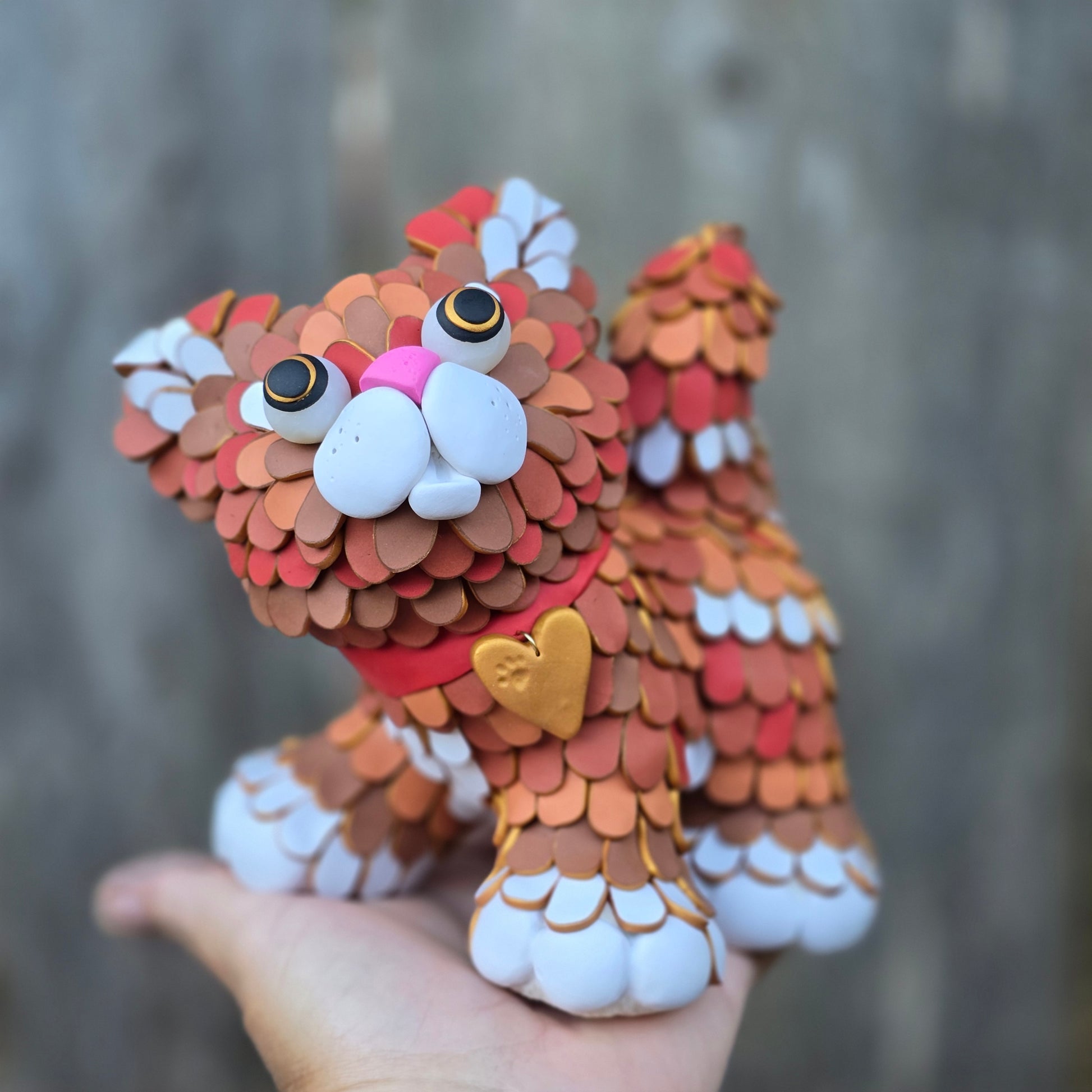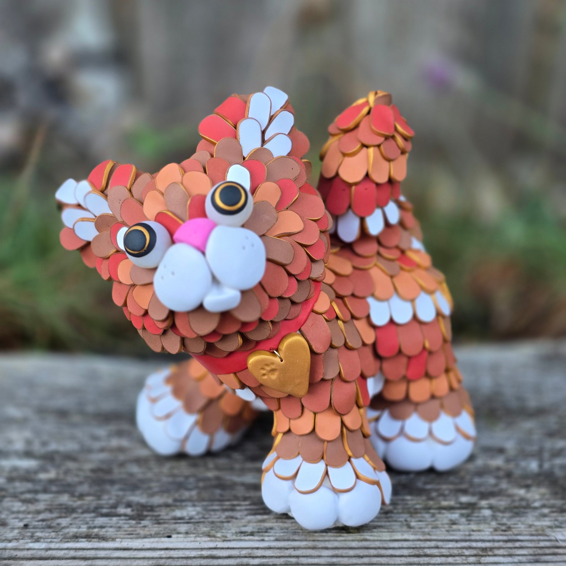 A playful ginger cat. Created from colored polymer clay canes over an armature. No paint. One of a kind.