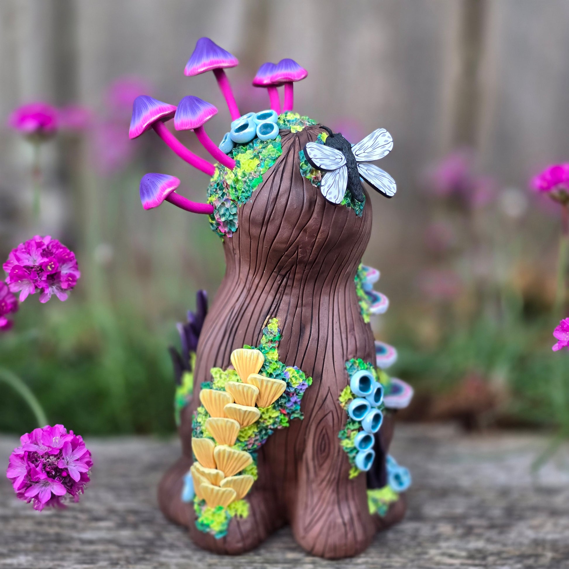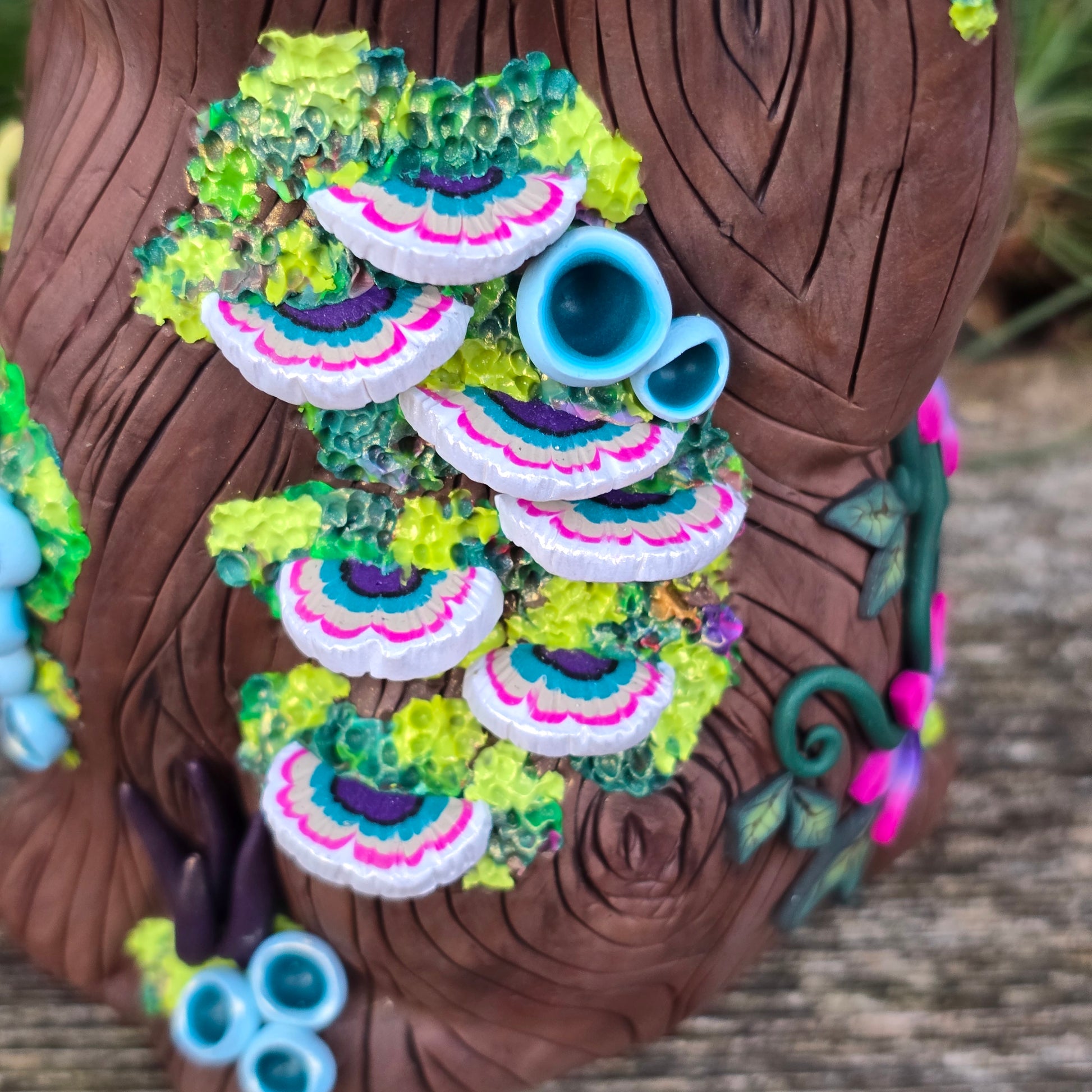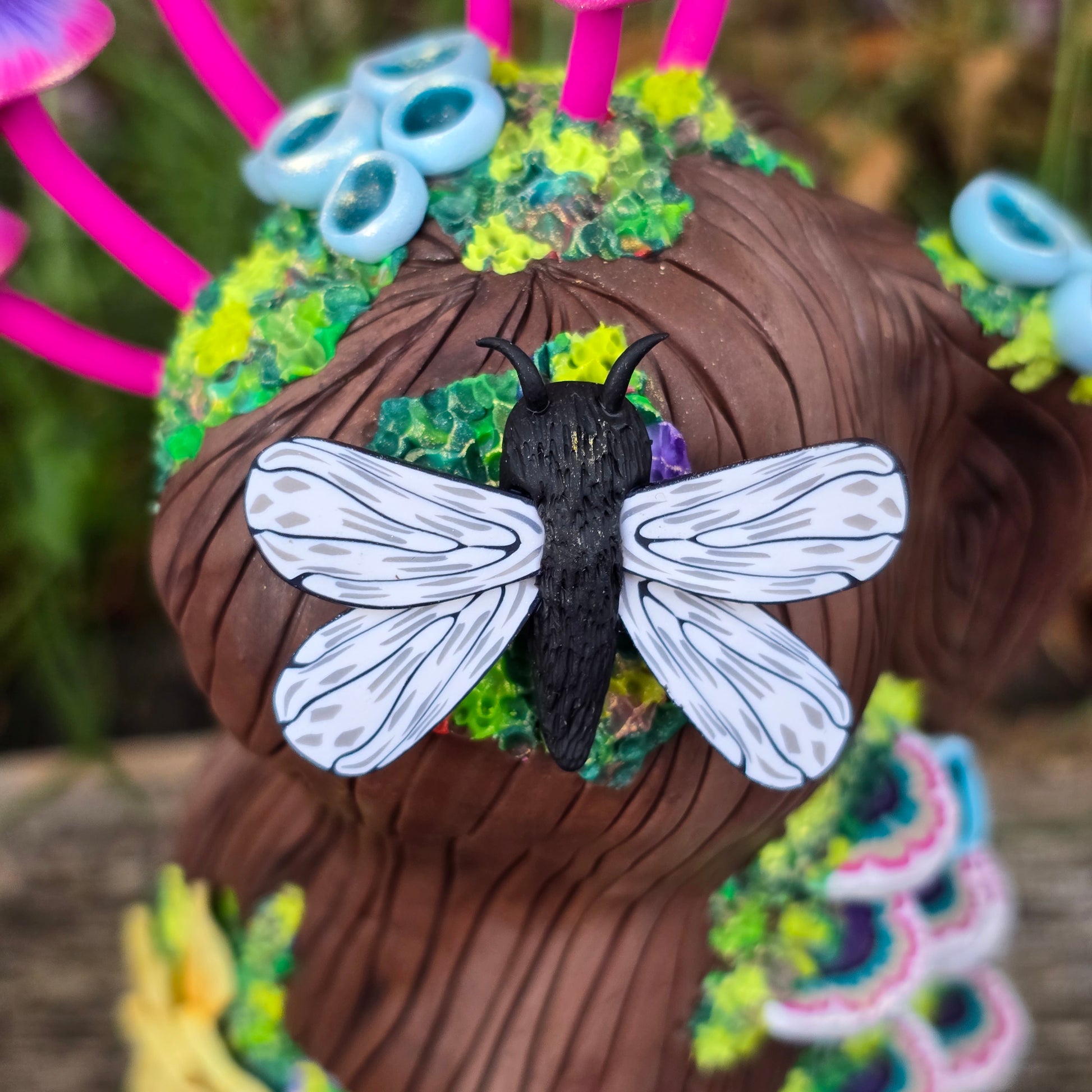 Created from colored polymer clay and my original millefiori canes over am armature. No paint.