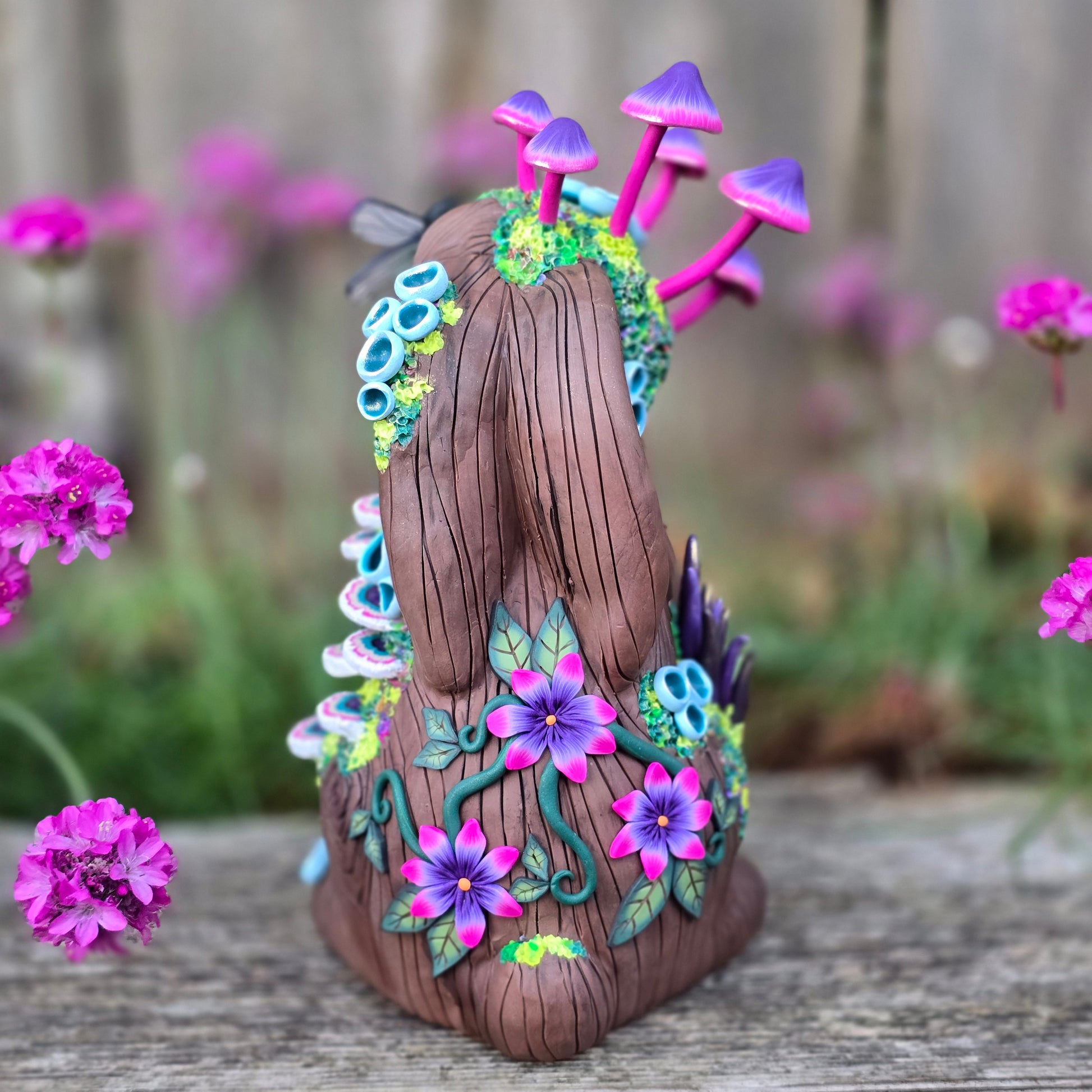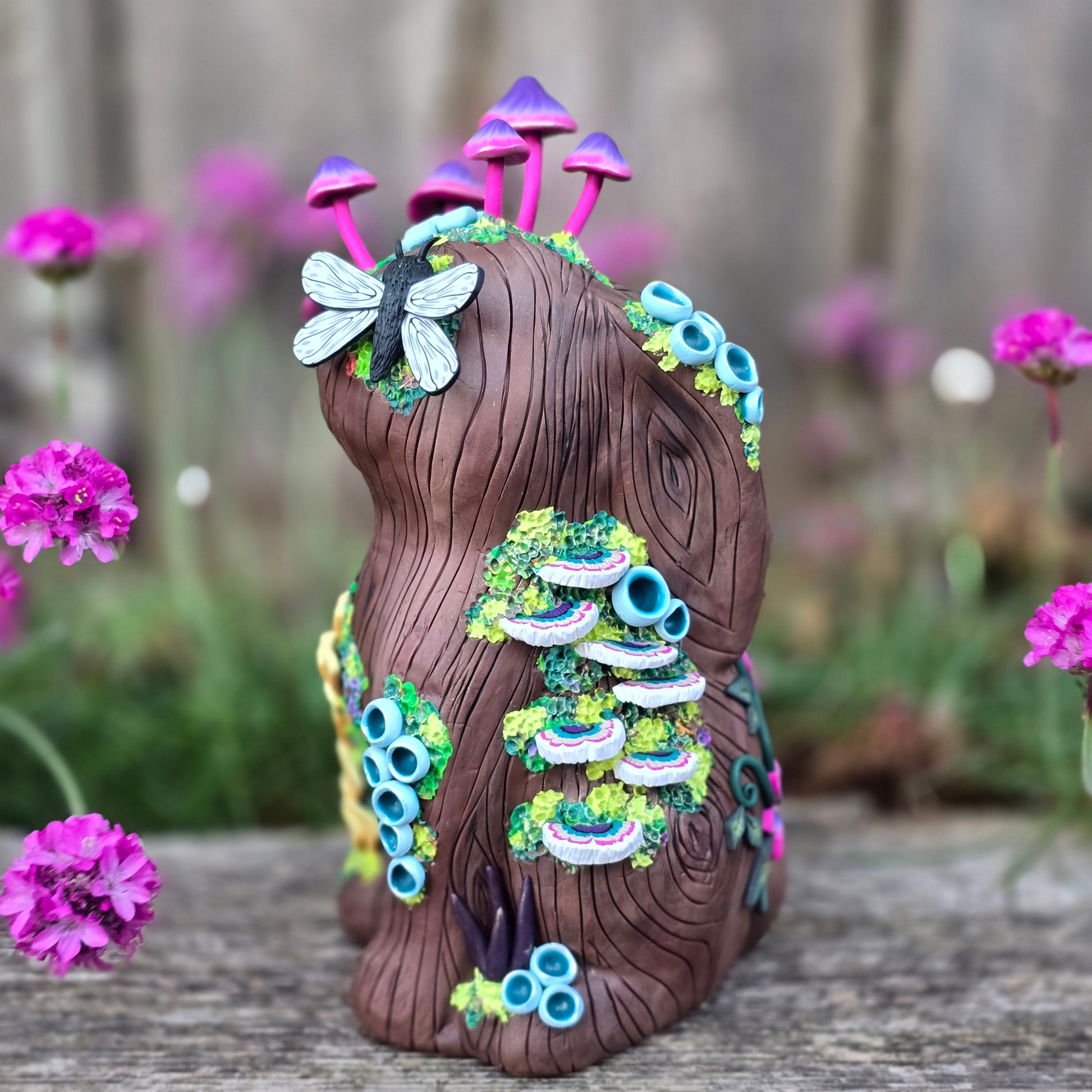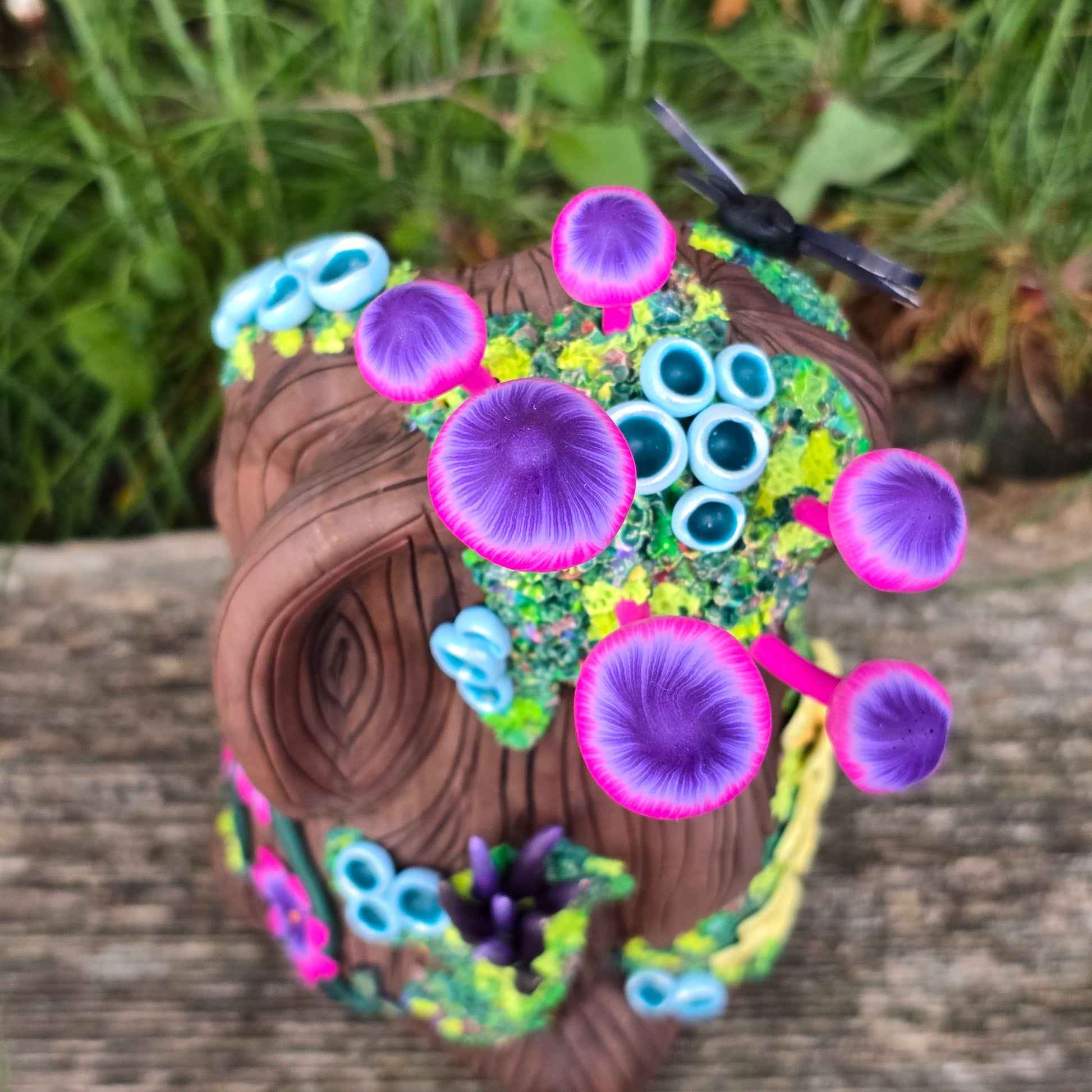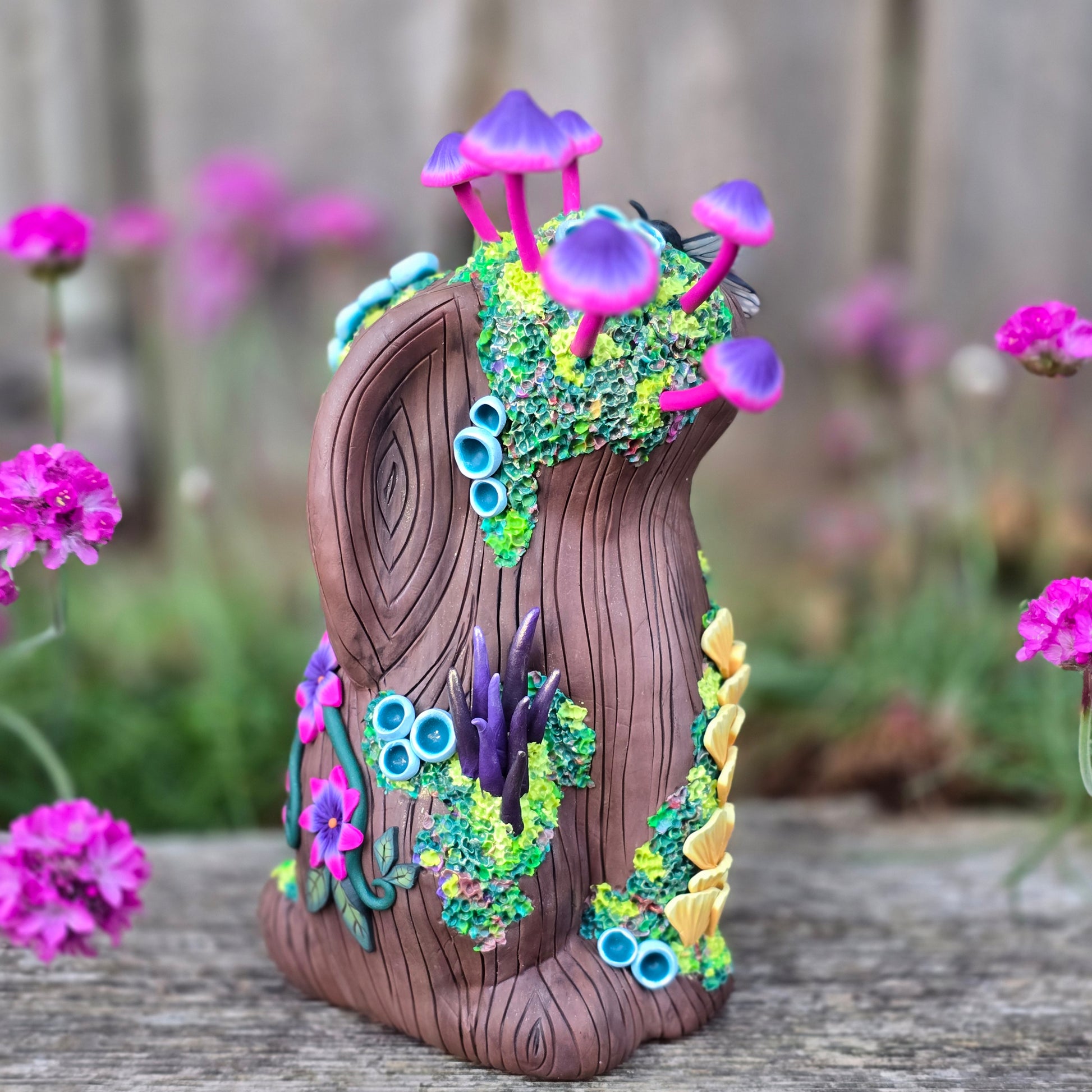 Created from colored polymer clay and my original millefiori canes over am armature. No paint.